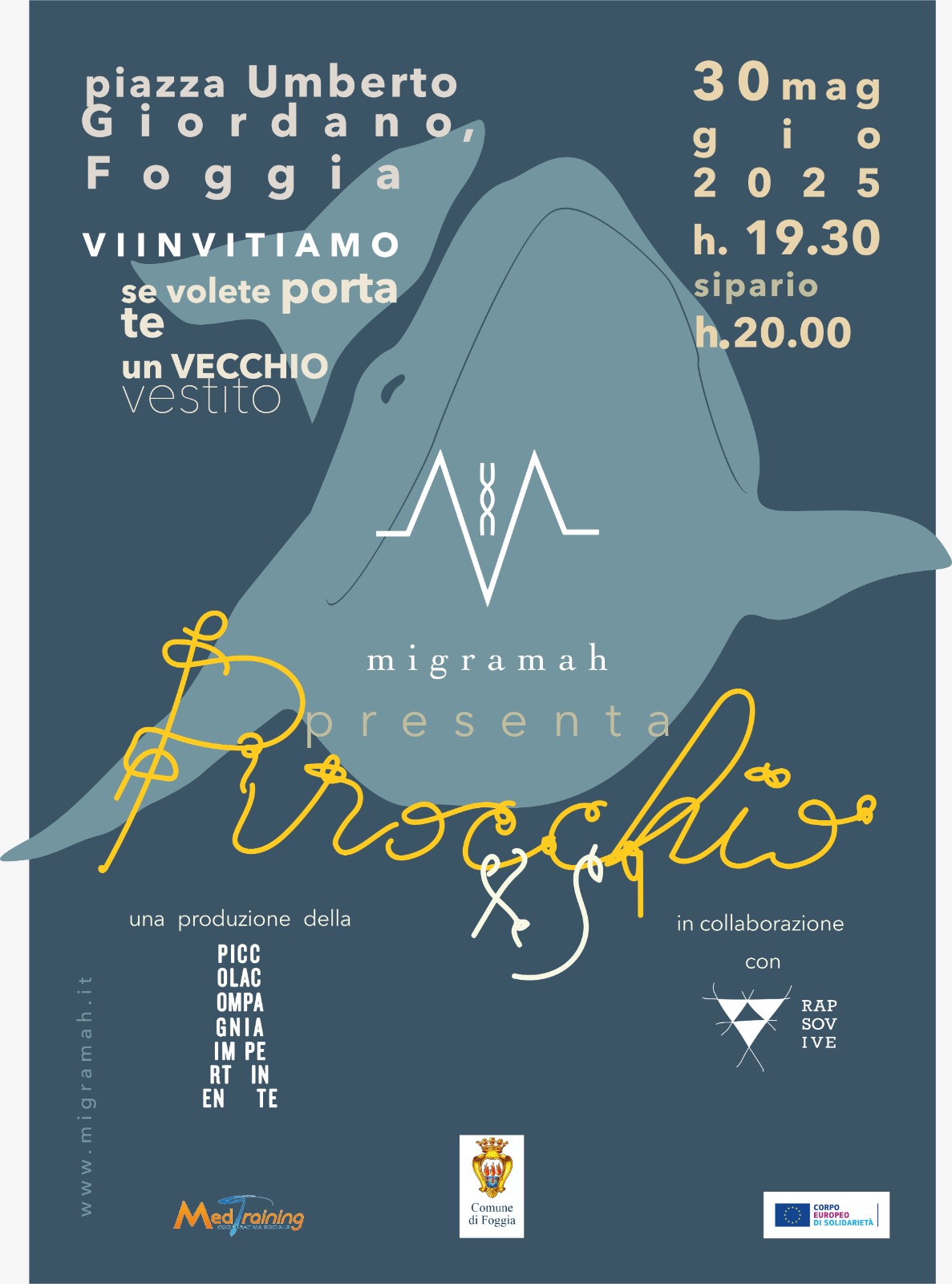 Andrà in scena a Foggia venerdì 30 maggio 2025, alle 19.30 in piazza Umberto Giordano “Pinocchio XS”, uno spettacolo-laboratorio dedicato a genitori e figli a partire dai 5 anni, a cura della Piccola Compagnia Impertinente. Si tratta di un’esperienza teatrale interattiva, dove narrazione, abiti vissuti e memoria collettiva si intrecciano per dare vita a un racconto condiviso. Protagonista è Edoardo Scartato, un ‘macrautore’ che canta e racconta storie cucite su tessuti dimenticati, in un mondo dominato dalla fast fashion. Accanto a lui, l’amico Lucio Colla e il pubblico, invitato a partecipare attivamente per la creazione collettiva di un “Macramé senza fili”. L’ingresso è gratuito. Ogni coppia adulto-bambino che partecipa può portare un vestito da regalare.