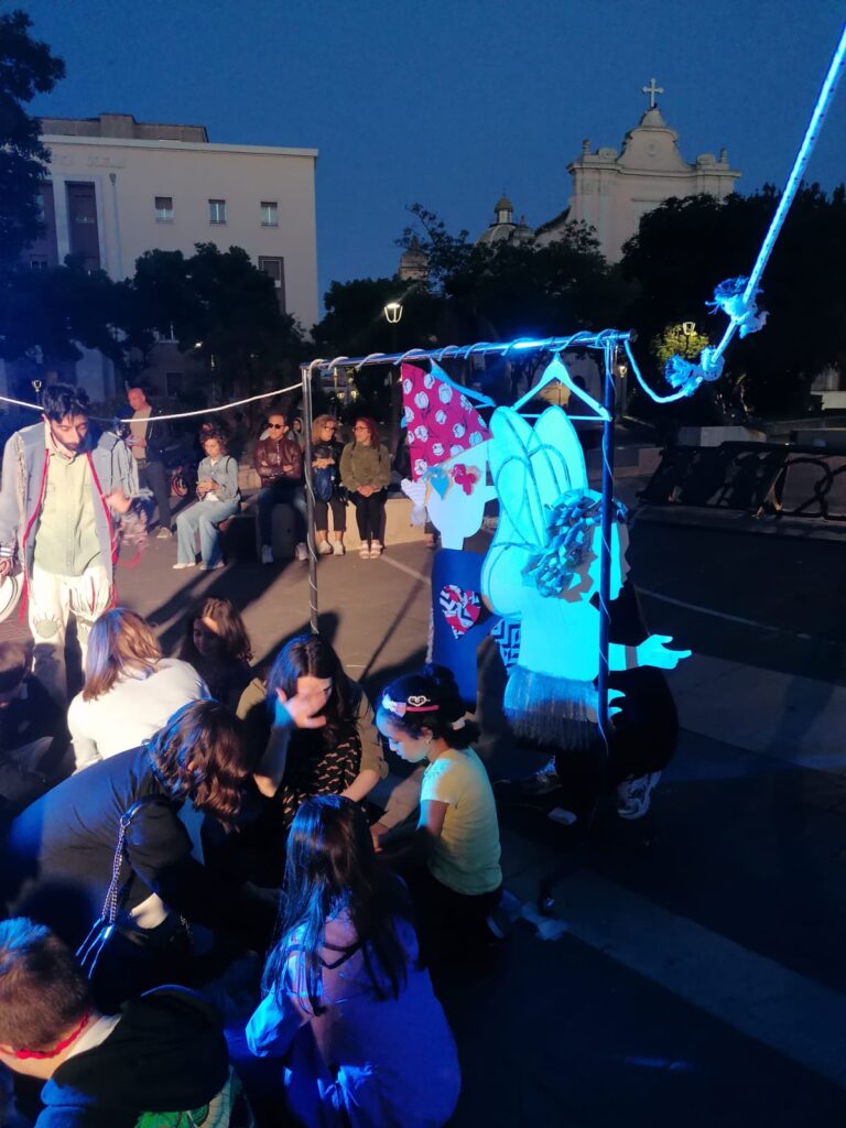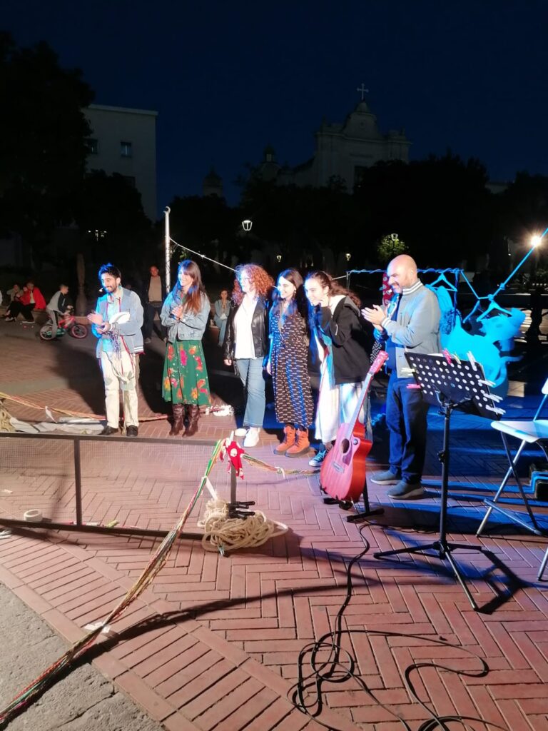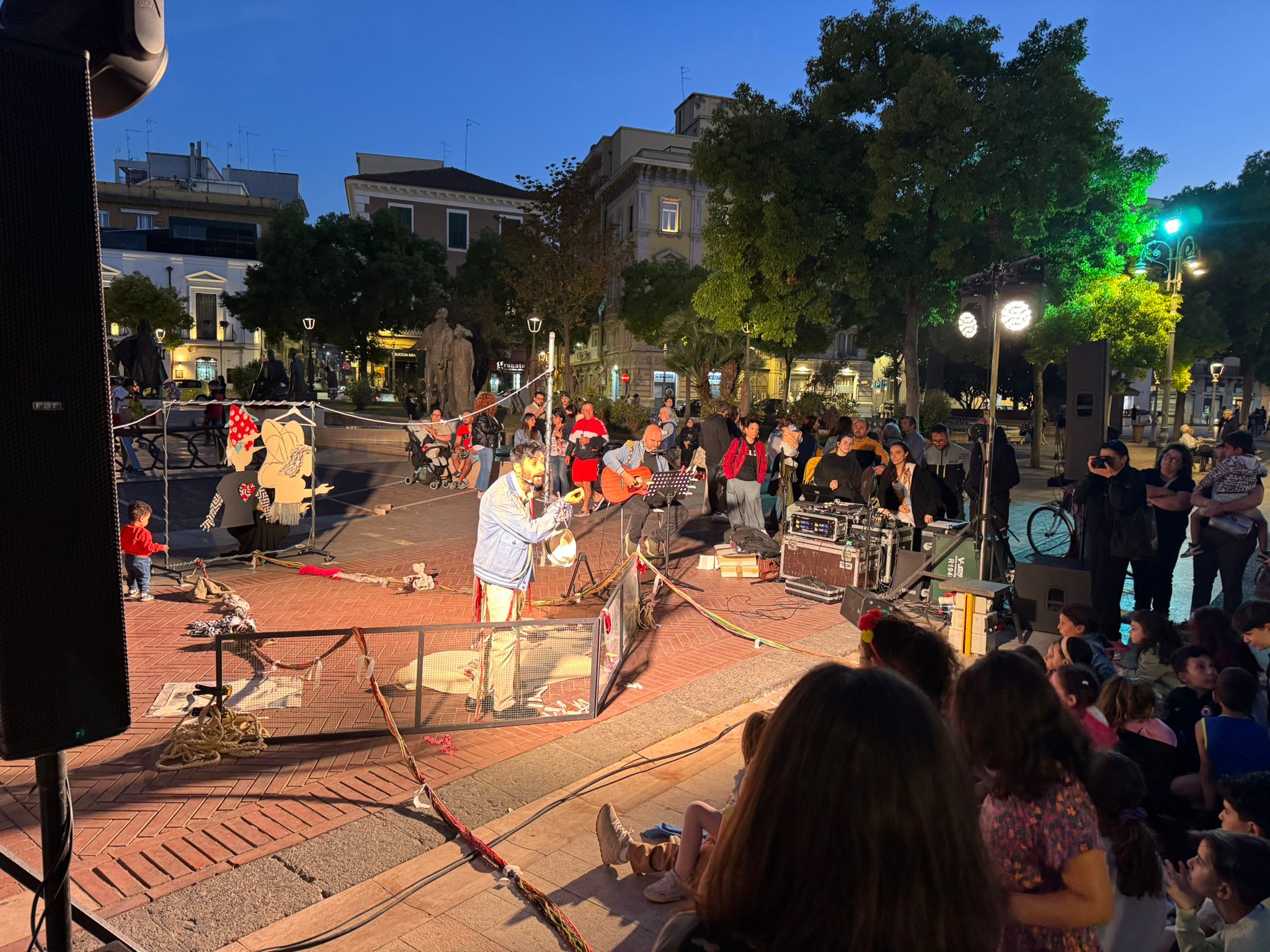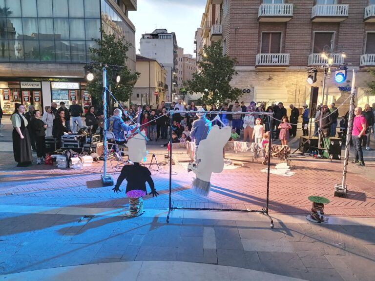 Un momento di magia, di poesia, di racconto. Un momento in cui vivere un momento di scambio attraverso “abiti” recuperati, vite stropicciate, storie da conoscere. Tutto questo è andato in scena a Foggia in piazza Umberto Giordano grazie a “𝐏𝐢𝐧𝐨𝐜𝐜𝐡𝐢𝐨 𝐗𝐒”, uno spettacolo-laboratorio dedicato a genitori e figli a partire dai 5 anni, a cura della Piccola compagnia impertinente. Un’esperienza teatrale interattiva, dove narrazione, abiti vissuti e memoria collettiva si sono intrecciti per dare vita a un racconto condiviso. Protagonista è stato Edoardo Scartato, un ‘macrautore’ che ha cantato e raccontato storie cucite su tessuti dimenticati, in un mondo dominato dalla fast fashion. Accanto a lui, l’amico Lucio Colla e il pubblico, invitato a partecipare attivamente per la creazione collettiva di un “Macramé senza fili”.
