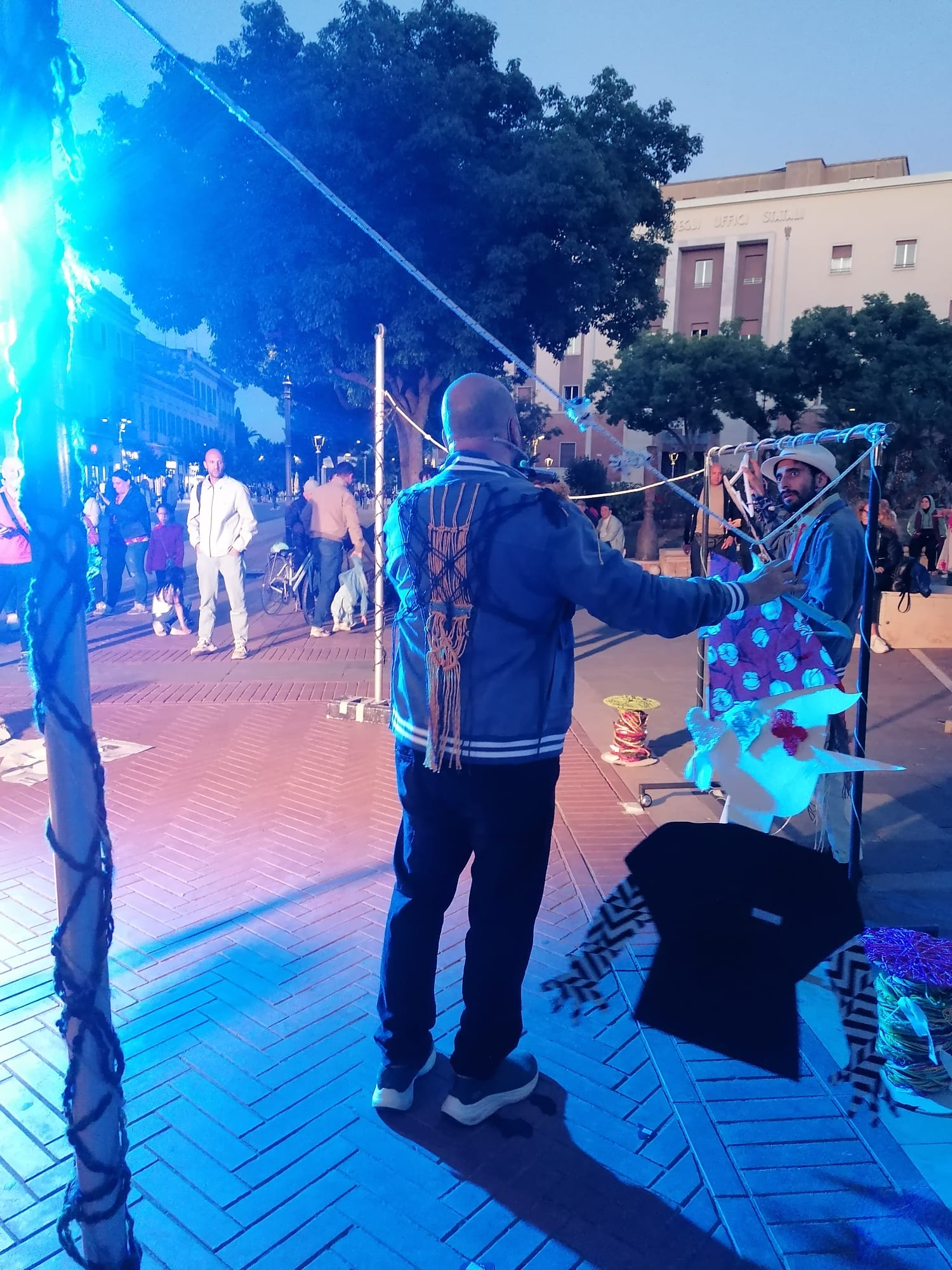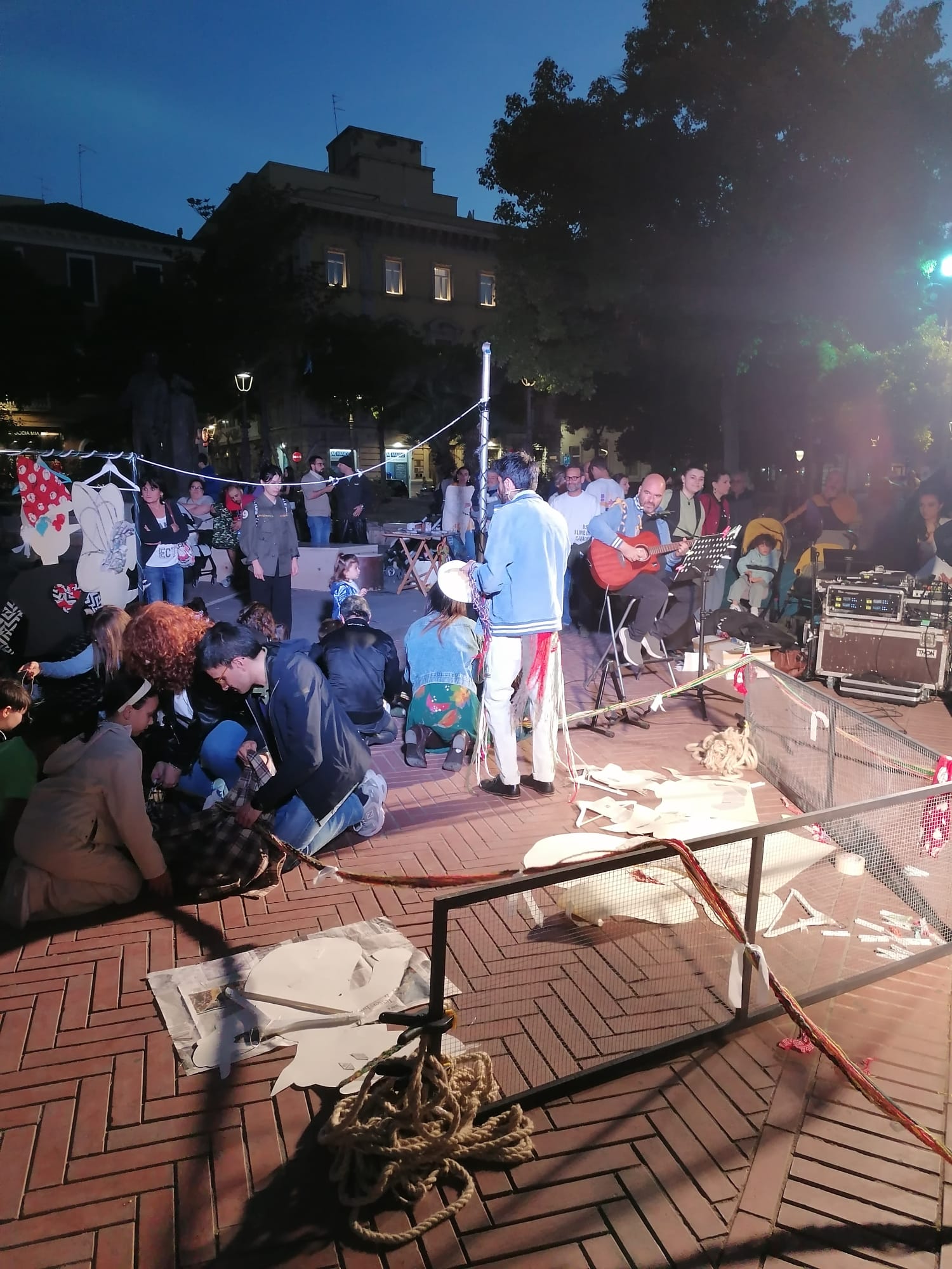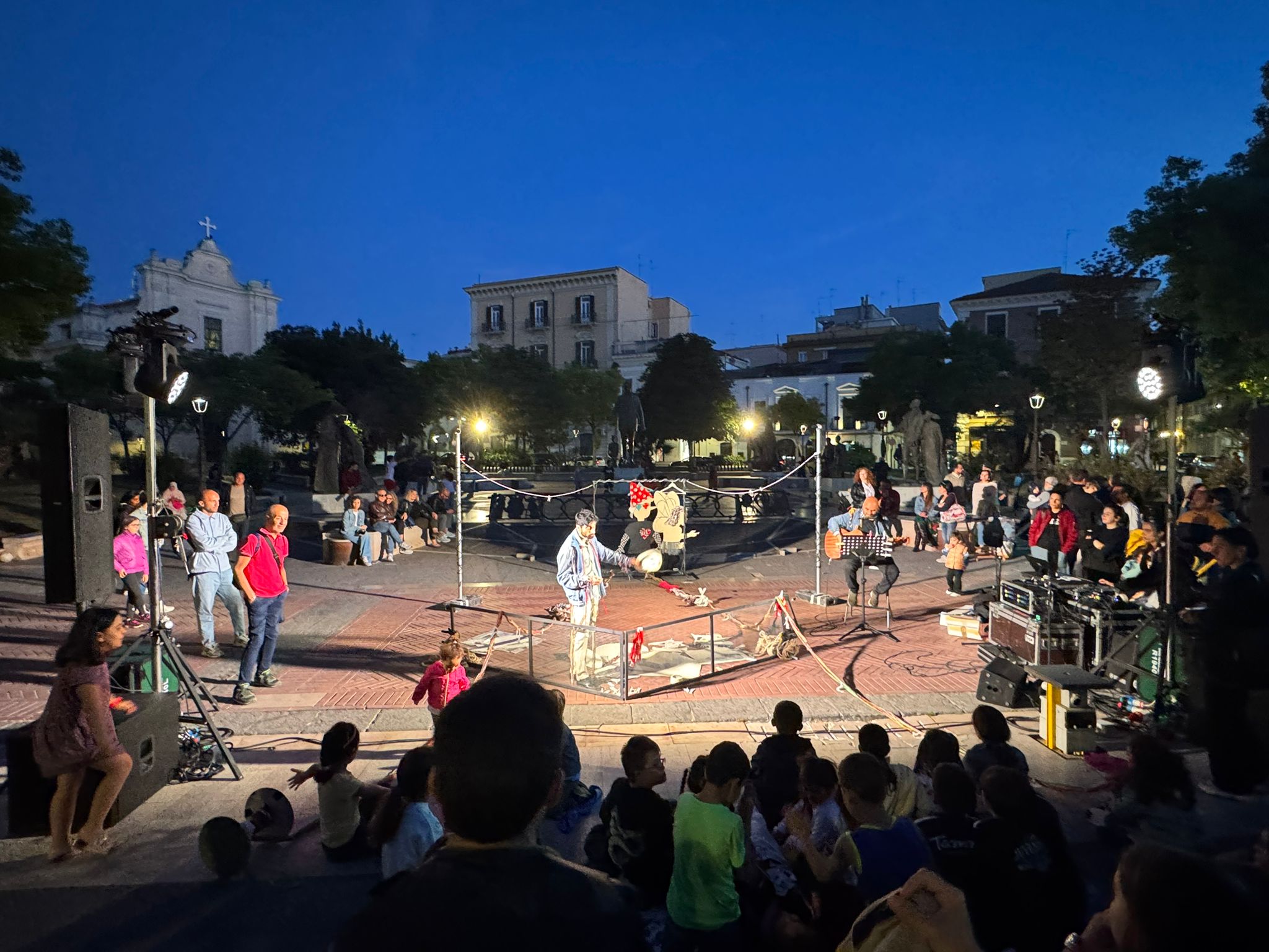 Un momento di magia, di poesia, di racconto. Un momento in cui vivere un momento di scambio attraverso “abiti” recuperati, vite stropicciate, storie da conoscere. Tutto questo è andato in scena a Foggia in piazza Umberto Giordano grazie a “𝐏𝐢𝐧𝐨𝐜𝐜𝐡𝐢𝐨 𝐗𝐒”, uno spettacolo-laboratorio dedicato a genitori e figli a partire dai 5 anni, a cura della Piccola compagnia impertinente. Un’esperienza teatrale interattiva, dove narrazione, abiti vissuti e memoria collettiva si sono intrecciti per dare vita a un racconto condiviso. Protagonista è stato Edoardo Scartato, un ‘macrautore’ che ha cantato e raccontato storie cucite su tessuti dimenticati, in un mondo dominato dalla fast fashion. Accanto a lui, l’amico Lucio Colla e il pubblico, invitato a partecipare attivamente per la creazione collettiva di un “Macramé senza fili”.
