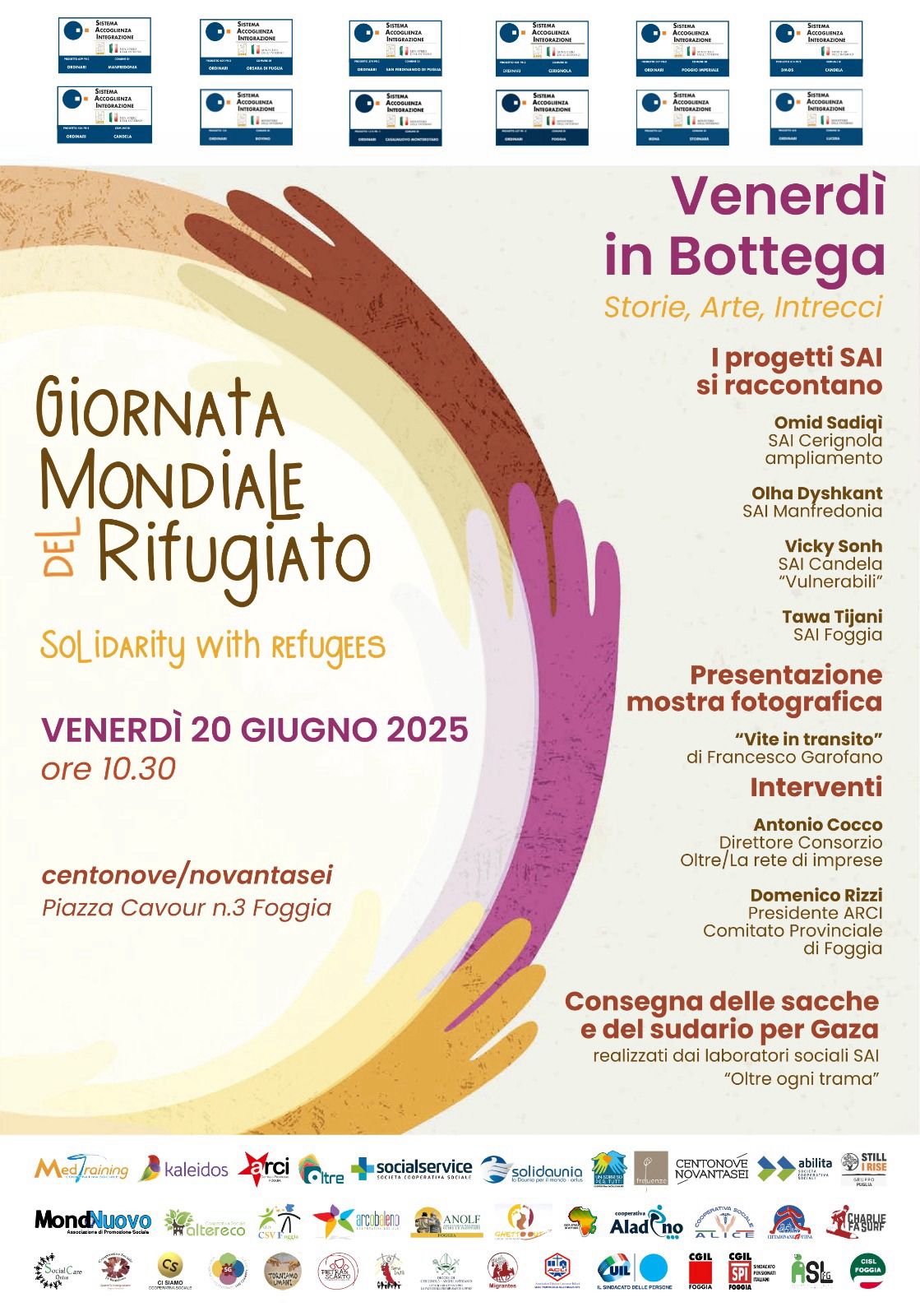 realizzati dai laboratori sociali SAI “Oltre ogni trama”, che coinvolgo beneficiarie e beneficiari dei progetti di Candela Vulnerabili, Cerignola ampliamento, Poggio Imperiale, la Puglia non tratta. Previsti anche gli interventi di Antonio Cocco, direttore consorzio Oltre la rete di imprese, e Domenico Rizzi presidente ARCI Comitato Provinciale di Foggia. Nel corso dell’incontro, aperto alla cittadinanza e alla stampa, saranno anche lanciati i prossimi appuntamenti, come la presentazione del libro “Non è stato il mare. Né a Cutro. Né altrove. Né prima. Né dopo” in programma il 24 giugno a Borgo Mezzanone e la “Giornata Mondiale del Rifugiato” che animerà piazza Primo Maggio a Cerignola il 26 giugno tra giochi per bambini, attività ludiche, treccine africane, danze popolari, musiche e tanto altro.