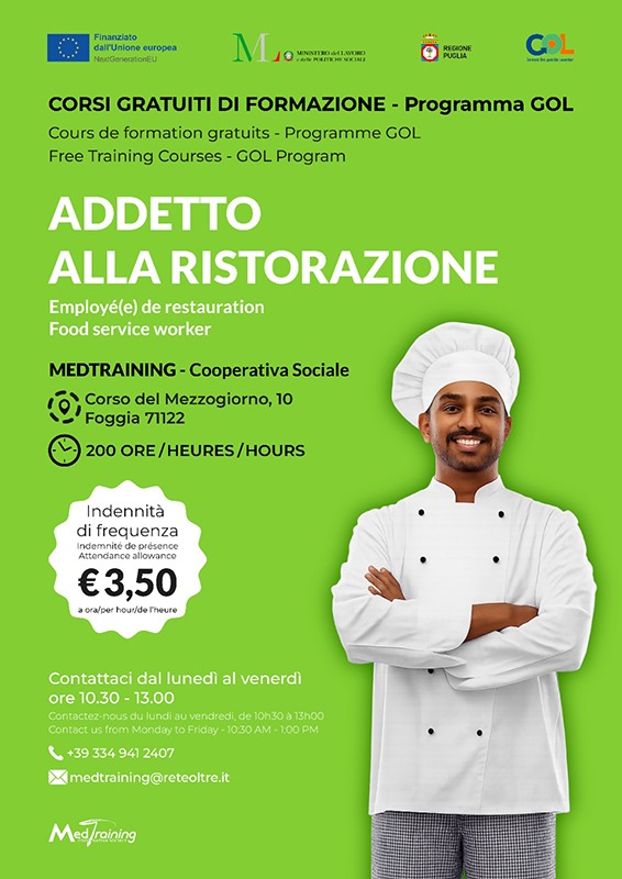 La cooperativa sociale Medtraining promuove nuovi percorsi formativi gratuiti per disoccupati nell’ambito del Programma GOL – Garanzia Occupabilità Lavoratori della Regione Puglia.