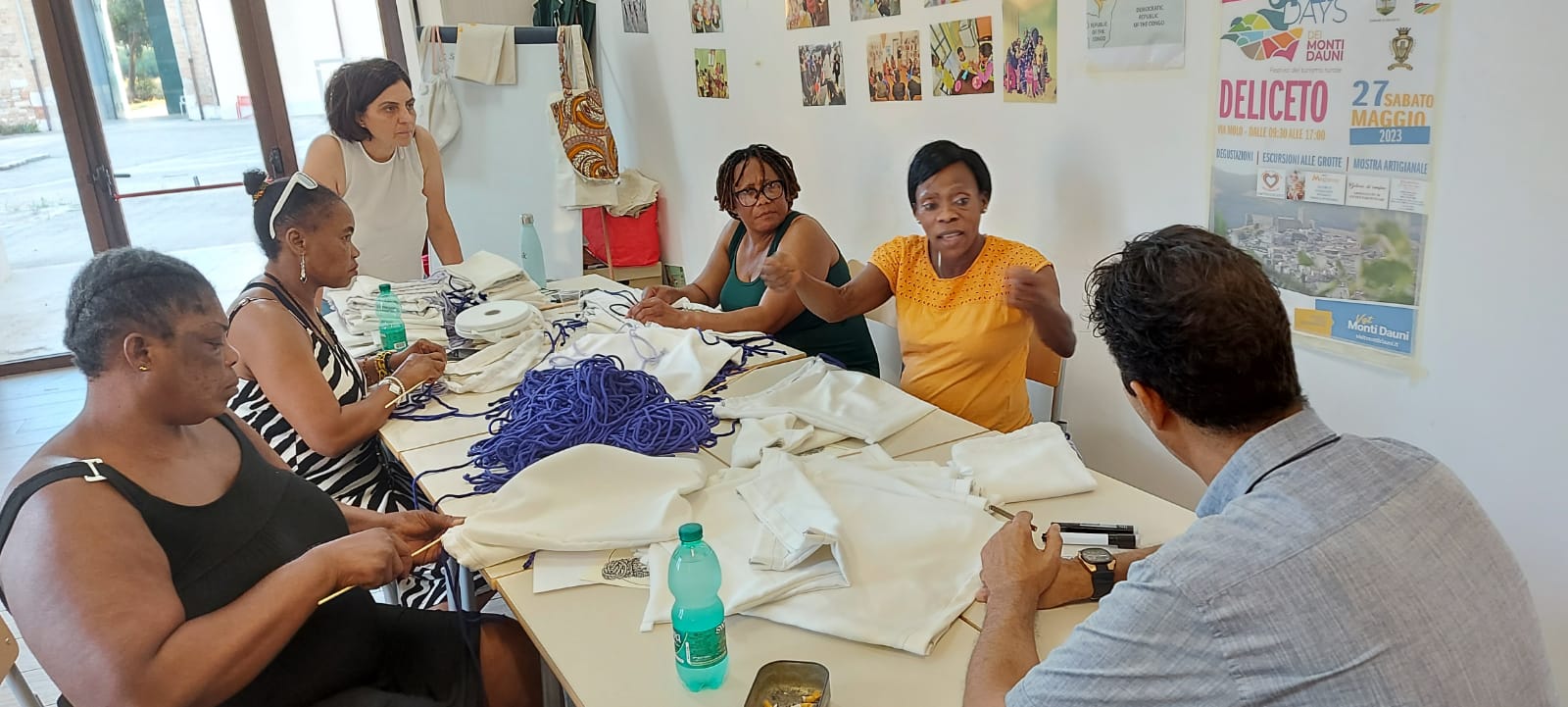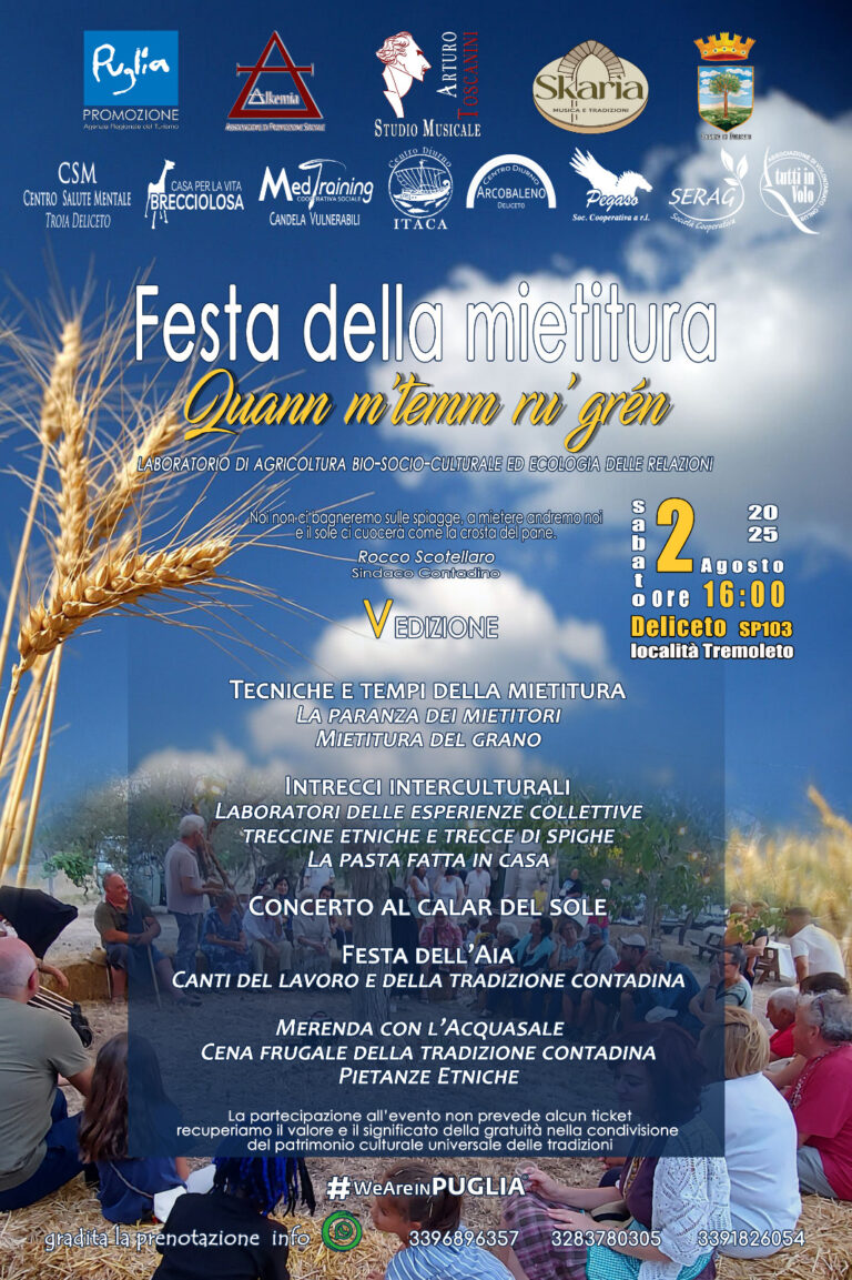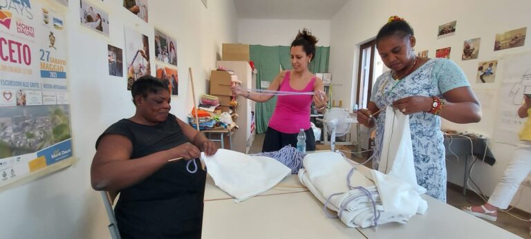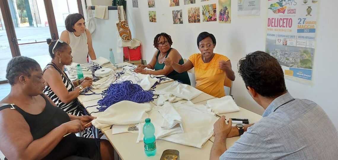 Nel laboratorio di sartoria creativa “𝐓𝐫𝐚𝐌𝐚𝐫𝐞𝐓𝐞𝐫𝐫𝐞 c’è aria di fermento. Stiamo realizzando le sacche che saranno offerte durante la “Festa della mietitura – Quann m’temme ‘ru grén” che si terrà a Deliceto sabato 2 agosto. Le stiamo realizzando con le beneficiarie del progetto 𝐒𝐀𝐈 – 𝐒𝐢𝐬𝐭𝐞𝐦𝐚 𝐝𝐢 𝐀𝐜𝐜𝐨𝐠𝐥𝐢𝐞𝐧𝐳𝐚 𝐞𝐝 𝐈𝐧𝐭𝐞𝐠𝐫𝐚𝐳𝐢𝐨𝐧𝐞 Candela Vulnerabili promosso dal Comune di Candela – Fg e gestito da Medtraining. Il Centro di Salute Mentale di Deliceto ha accettato di collaborare alla realizzazione delle sacche: noi le cuciamo e gli ospiti del Centro Diurno Arcobaleno le confezionano. È il terzo anno che partecipiamo, come Candela Vulnerabili, a questo evento organizzato da Alkemia e Gruppo Folk Skarìa, al quale collaborano alcune realtà che si prendono cura delle fragilità sul territorio. Lo scorso anno Vicky si è resa protagonista battendo, in tempi e forza fisica, tutti i mietitori. Lei era proprietaria di una piantagione di cacao in Costa d’Avorio. L’esperienza del lavoro nel suo campo sarà la testimonianza che porteremo in dono, oltre le sacche e il cibo etnico, ai partecipanti alla Festa.