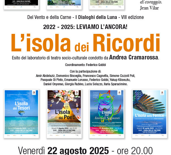 «La memoria è una forma di coraggio», scriveva Jean Vilar, regista teatrale e attore. Perché il teatro mostra sempre forme di coraggio nell’inseguire la verità, nel ricostruire fatti, nel suo senso di partecipazione e di senso civile. Lo sappiamo bene qui a 𝐂𝐚𝐬𝐚 𝐝𝐞𝐥𝐥𝐞 𝐂𝐮𝐥𝐭𝐮𝐫𝐞 𝐝𝐢 𝐁𝐚𝐫𝐢 che in questi anni ha organizzato la bellissima esperienza di “𝐃𝐞𝐥 𝐕𝐞𝐧𝐭𝐨 𝐞 𝐝𝐞𝐥𝐥𝐚 𝐂𝐚𝐫𝐧𝐞 – 𝐈 𝐝𝐢𝐚𝐥𝐨𝐠𝐡𝐢 𝐝𝐞𝐥𝐥𝐚 𝐥𝐮𝐧𝐚”, il laboratorio teatrale socio-culturale condotto da Andrea Cramarossa del Teatro Delle Bambole. Otto edizioni che hanno permesso di incontrare storie, di creare “ponti”, di scoprire l’umanità, di creare momenti di riflessione.