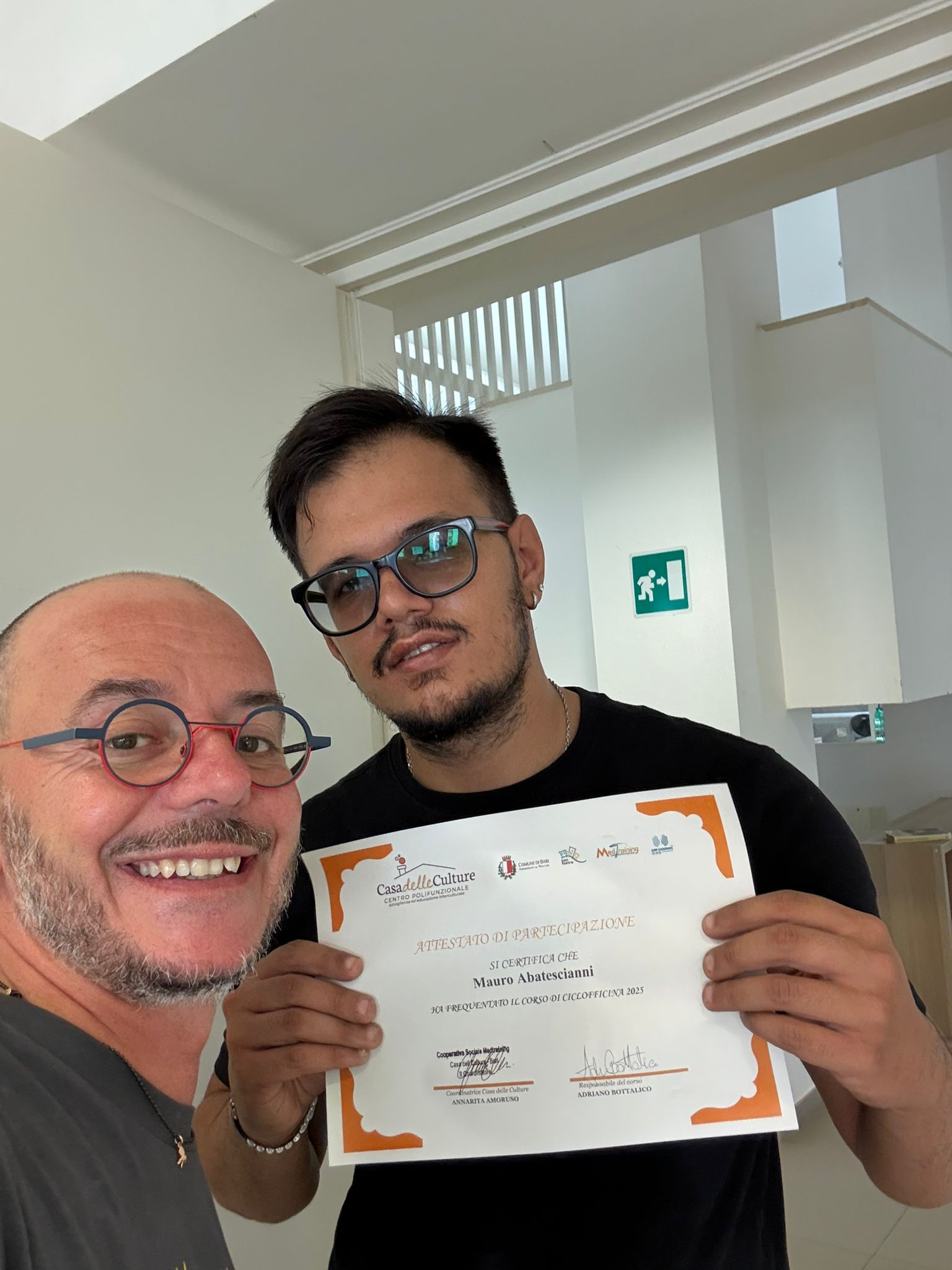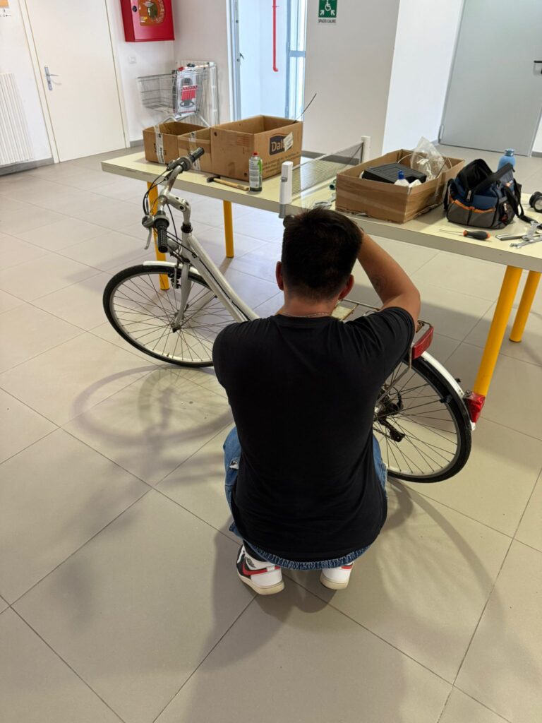 Quello che si sta svolgendo a è un lavoro importante. Perché da un lato rafforza la flotta di biciclette che viene messa a disposizione di ospiti e operatori che devono spostarsi per lavoro o per svolgere servizi; dall’altro, forma novelli meccanici che acquisiscono competenze per sistemare biciclette spendibili anche nel mondo del lavoro. E così, anche ieri il maestro Adriano Bottalico ha consegnato l’attestato a un ragazzo che ha concluso il 𝐋𝐚𝐛𝐨𝐫𝐚𝐭𝐨𝐫𝐢𝐨 𝐝𝐢 𝐂𝐢𝐜𝐥𝐨𝐟𝐟𝐢𝐜𝐢𝐧𝐚 pre-professionalizzante rivolto a partecipanti migranti ed italiani che organizziamo negli spazi di 𝐂𝐚𝐬𝐚 𝐝𝐞𝐥𝐥𝐞 𝐂𝐮𝐥𝐭𝐮𝐫𝐞 𝐝𝐢 𝐁𝐚𝐫𝐢.
