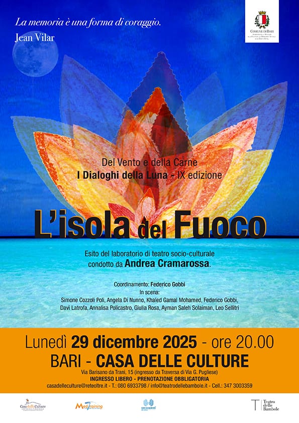 «La memoria è una forma di coraggio», scriveva Jean Vilar, regista teatrale e attore. Perché il teatro mostra sempre forme di coraggio nell’inseguire la verità, nel ricostruire fatti, nel suo senso di partecipazione e di senso civile. Lo sappiamo bene qui a 𝐂𝐚𝐬𝐚 𝐝𝐞𝐥𝐥𝐞 𝐂𝐮𝐥𝐭𝐮𝐫𝐞 𝐝𝐢 𝐁𝐚𝐫𝐢 che abbiamo organizzato la IX edizione “𝐃𝐞𝐥 𝐕𝐞𝐧𝐭𝐨 𝐞 𝐝𝐞𝐥𝐥𝐚 𝐂𝐚𝐫𝐧𝐞 – 𝐈 𝐝𝐢𝐚𝐥𝐨𝐠𝐡𝐢 𝐝𝐞𝐥𝐥𝐚 𝐥𝐮𝐧𝐚”, il laboratorio teatrale socio-culturale condotto da Andrea Tdb Cramarossa del Teatro Delle Bambole. 𝐋𝐮𝐧𝐞𝐝𝐢̀ 𝟐𝟗 𝐝𝐢𝐜𝐞𝐦𝐛𝐫𝐞 2025, alle ore 20.00, nell’auditorium di 𝐂𝐚𝐬𝐚 𝐝𝐞𝐥𝐥𝐞 𝐂𝐮𝐥𝐭𝐮𝐫𝐞, va in scena “𝐋’𝐢𝐬𝐨𝐥𝐚 𝐝𝐞𝐥 𝐅𝐮𝐨𝐜𝐨”, a cura di Andrea Cramarossa e il coordinamento di Federico Gobbi. E’ l’occasione per restituire al pubblico il cammino compiuto in questi ultimi mesi, che ha permesso ai partecipanti di incontrare storie, creare “ponti”, scoprire l’umanità, suscitare momenti di riflessione.