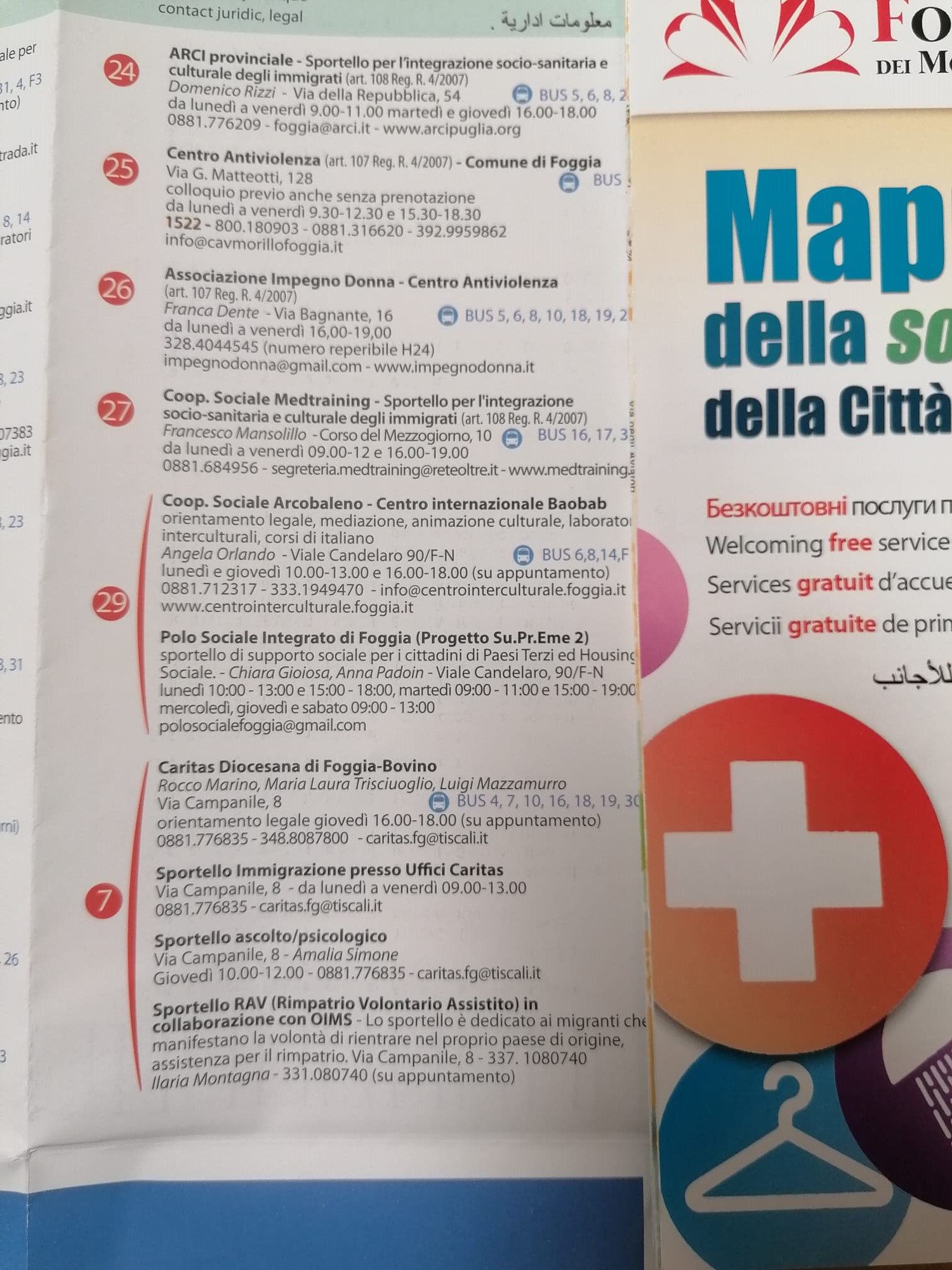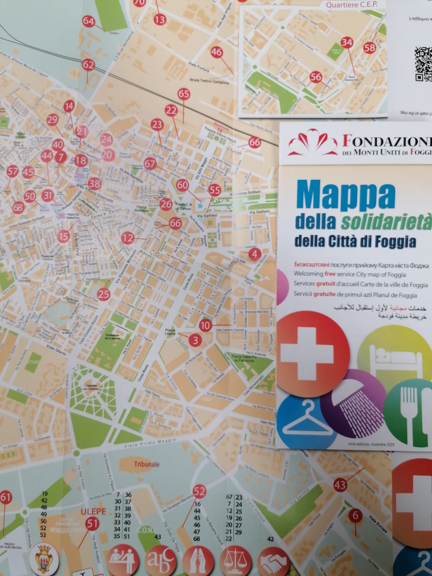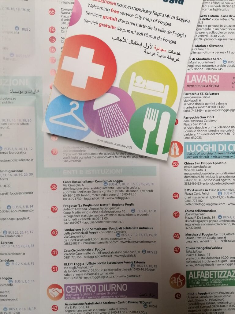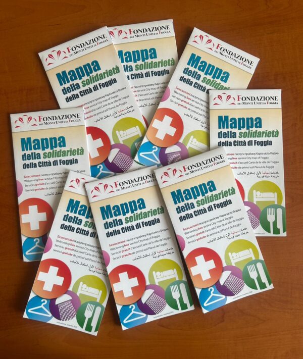 Giunta alla nona edizione e realizzata dal CSV Foggia, con il sostegno della Fondazione dei Monti Uniti di Foggia, “𝐌𝐚𝐩𝐩𝐚 𝐝𝐞𝐥𝐥𝐚 𝐒𝐨𝐥𝐢𝐝𝐚𝐫𝐢𝐞𝐭𝐚̀ 𝐝𝐞𝐥𝐥𝐚 𝐜𝐢𝐭𝐭𝐚̀ 𝐅𝐨𝐠𝐠𝐢𝐚” rappresenta uno strumento, accessibile e tascabile, con informazioni utili per poveri, persone senza dimora, migranti che necessitano di orientamento. La nuova edizione è tradotta in cinque lingue: 𝐮𝐜𝐫𝐚𝐢𝐧𝐨, 𝐢𝐧𝐠𝐥𝐞𝐬𝐞, 𝐟𝐫𝐚𝐧𝐜𝐞𝐬𝐞, 𝐫𝐮𝐦𝐞𝐧𝐨 𝐞 𝐚𝐫𝐚𝐛𝐨. I servizi sono suddivisi in dodici macroaree di riferimento: curarsi, lavarsi, mangiare, vestiario, dormire, orientamento legale, enti e istituzioni, alfabetizzazione, centro diurno, luoghi di culto, i servizi del Comune di Foggia, i bagni pubblici. La mappa, arricchita da una versione digitale interattiva consultabile tramite QR Code o sul sito del CSV Foggia, è distribuita anche nella sede di Medtraining e del consorzio Oltre / la rete di imprese in corso del Mezzogiorno 10, e nei vari progetti in cui operiamo in settori quali accoglienza, tutela e inclusione socio-lavorativa.