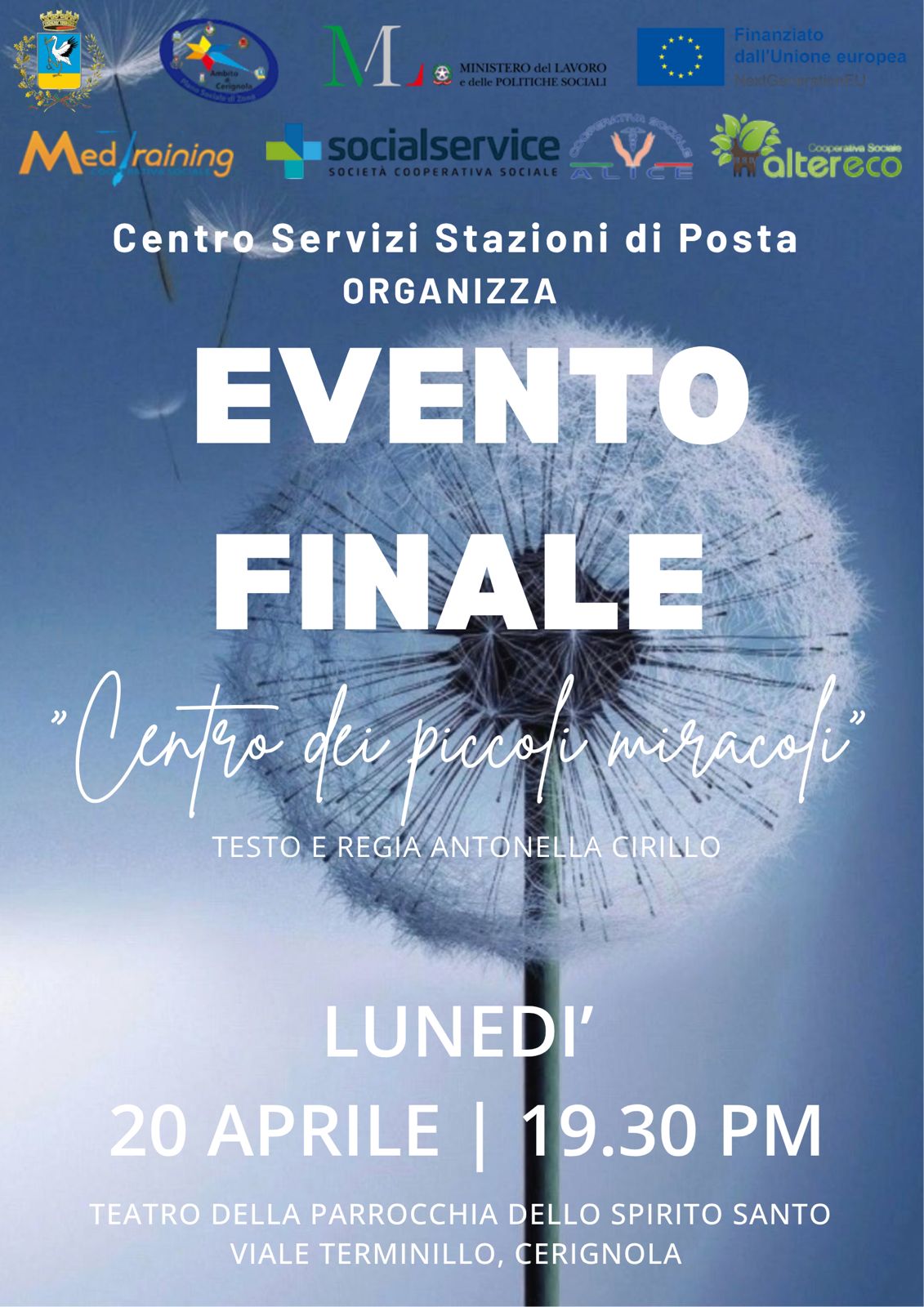 I laboratori e gli eventi finali sono organizzati dal servizio “Stazioni di Posta” gestito dalle cooperative sociali SocialService, Medtraining, Altereco e Alice. Il centro interviene ed offre interventi nei casi di povertà estrema che riguardano cittadini italiani e migranti, il cui obiettivo ultimo è l’accompagnamento all’autonomia. Offre attività di prima assistenza sanitaria, consulenza amministrativa e legale, orientamento al lavoro, mediazione culturale, accompagnamento alla residenza fittizia, deposito bagagli, fermo posta. Promosso dall’Ambito Territoriale di Cerignola è finanziato dal Piano Nazionale di Ripresa e Resilienza (PNRR), Missione 5 “Inclusione e coesione”, Componente 2 “Infrastrutture sociali, famiglie, comunità e terzo settore”, Sottocomponente 1 “Servizi sociali, disabilità e marginalità sociale”, Investimento 1.3.2 “Povertà estrema- Stazioni di Posta” – Progetto finanziato dall’Unione Europea – NextGenerationEU.