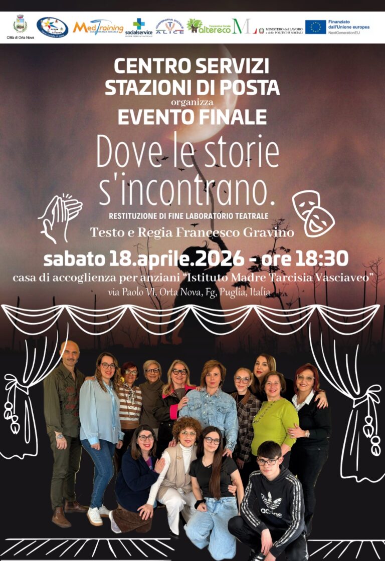 Si comincia sabato 18 aprile 2026, ad Orta Nova, alle ore 18.30, presso Casa di Accoglienza per Anziani “Istituto Madre Tarcisia Vasciaveo, in via Paolo VI, con la messa in scena dello spettacolo “Dove le storie si incontrano”. Testo e regia di Francesco Gravino che ha curato questo laboratorio teatrale. Sarà anche allestita la mostra delle tele realizzate dai partecipanti al laboratorio di “Arte e Pittura” guidato dalla docente Giuditta Ciffo. Lunedì 20 aprile, invece, sarà Cerignola ad ospitare la performance teatrale “Centro dei piccoli miracoli”, in programma a partire dalle ore 19.30 nel teatro della parrocchia dello Spirito Santo, in viale Terminillo. Testo e regia di Antonella Cirillo, che ha curato il cammino formativo. Anche in questo caso, sarà allestita la mostra delle tele realizzate dai partecipanti al laboratorio di “Arte e Pittura” guidato sempre dalla docente Giuditta Ciffo. In entrambi i comuni saranno presenti le istituzioni locali dell’Ambito Territoriale.