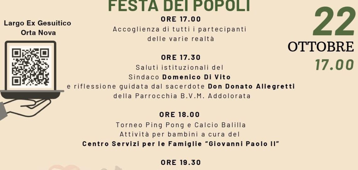Un momento di riflessione, di socializzazione e di confronto per sensibilizzare il territorio sul tema riguardante i migranti e i rifugiati che vivono nelle nostre comunità. Un evento per celebrare l’incontro tra popoli e culture, costruendo insieme ponti di pace e di integrazione. È il senso dell’iniziativa “Migranti Portatori di speranza. Missionari di Umanità” in programma mercoledì 22 ottobre 2025 ad Orta Nova in occasione della “Giornata Mondiale del Migrante e del Rifugiato”, che dal 1914 offre l’opportunità di esprimere vicinanza e solidarietà a tutte quelle persone che, per molteplici ragioni, sono costrette a spostarsi e a vivere in condizioni di vulnerabilità. Il Centro Servizi “Stazioni di posta” attivo nell’Ambito Territoriale di Cerignola hanno quindi organizzato un evento…
