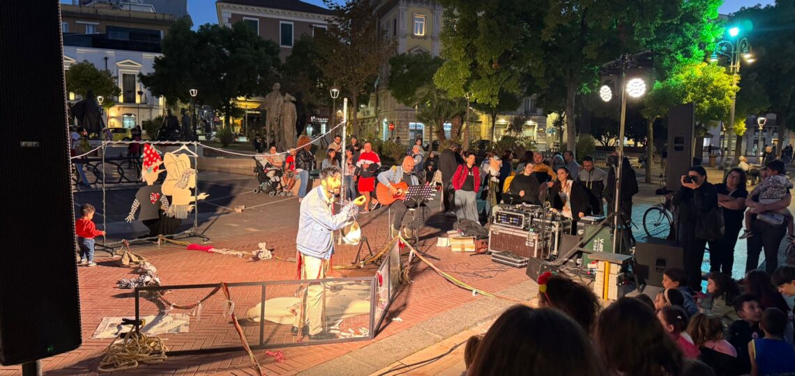 Un momento di magia, di poesia, di racconto. Un momento in cui vivere un momento di scambio attraverso “abiti” recuperati, vite stropicciate, storie da conoscere. Tutto questo è andato in scena a Foggia in piazza Umberto Giordano grazie a “𝐏𝐢𝐧𝐨𝐜𝐜𝐡𝐢𝐨 𝐗𝐒”, uno spettacolo-laboratorio dedicato a genitori e figli a partire dai 5 anni, a cura della Piccola compagnia impertinente. Un’esperienza teatrale interattiva, dove narrazione, abiti vissuti e memoria collettiva si sono intrecciti per dare vita a un racconto condiviso. Protagonista è stato Edoardo Scartato, un ‘macrautore’ che ha cantato e raccontato storie cucite su tessuti dimenticati, in un mondo dominato dalla fast fashion. Accanto a lui, l’amico Lucio Colla e il pubblico, invitato a partecipare attivamente per la…